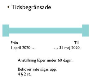Till skillnad från tillsvidareanställning gäller de tidsbegränsade avtalen, som de låter, mellan två datum. Sådana avtal för normalt inte sägas upp i förtid. Men när slutdatum i avtal infaller tar också anställningen slut. Den behöver inte sägas upp (till skillnad från tillsvidaretjänsten). Det innebär anställningen inte är lika säker som en tillsvidaretjänst.