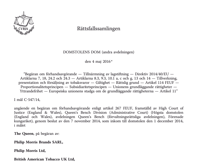 Målet Philip Morris (Mål C-547/14) vid Europeiska unionens domstol rörde en tvist om tobaksproduktdirektivet (2014/40/EU). Denna lagstiftning var ett försök av EU att harmonisera reglerna för tillverkning, presentation och försäljning av tobaksprodukter inom unionen. Philip Morris International och andra tobaksföretag väckte talan mot denna lagstiftning, och argumenterade att vissa bestämmelser i direktivet var oförenliga med EU:s lagstiftning.