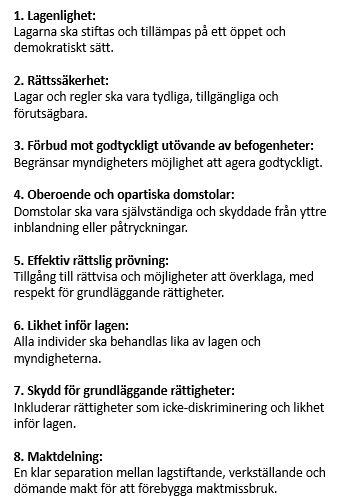 Förbud mot godtyckligt agerande: Myndigheter och statliga organ får inte handla godtyckligt. Detta säkerställs genom att deras beslut och åtgärder grundas på lagar, och genom system för att övervaka och utmana deras beslut.