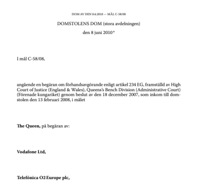 Vodafone-fallet (Mål C-58/08) vid Europeiska unionens domstol handlade om en juridisk utmaning mot EU:s förordning som syftade till att begränsa roamingavgifter (en extra kostnad som mobiltelefonanvändare kan behöva betala när de använder sitt mobilabonnemang utanför det egna landet) för mobiltelefonanvändare inom EU. Flera stora telekommunikationsföretag, däribland Vodafone, argumenterade mot denna förordning. De hävdade att EU överskred sin behörighet och att förordningen kränkte deras rättigheter att bedriva näringsverksamhet. Dessutom ifrågasattes förordningens proportionalitet och förenlighet med subsidiaritetsprincipen.