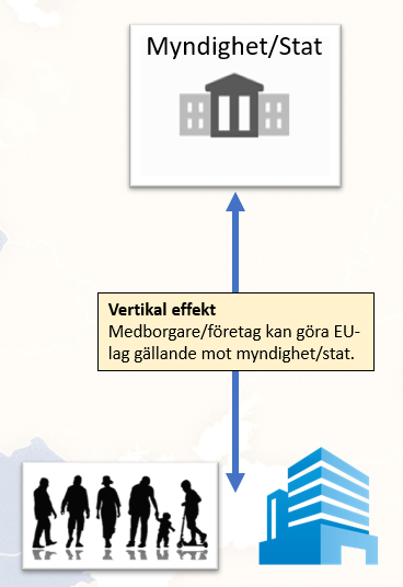 1. Vertikal direkt effekt: Om en medlemsstat inte har implementerat direktivet, eller har implementerat det på ett felaktigt sätt, och tidsfristen för implementeringen har gått ut, kan enskilda ibland åberopa direktivet i rättegångar mot staten. Detta kallas för vertikal direkt effekt.