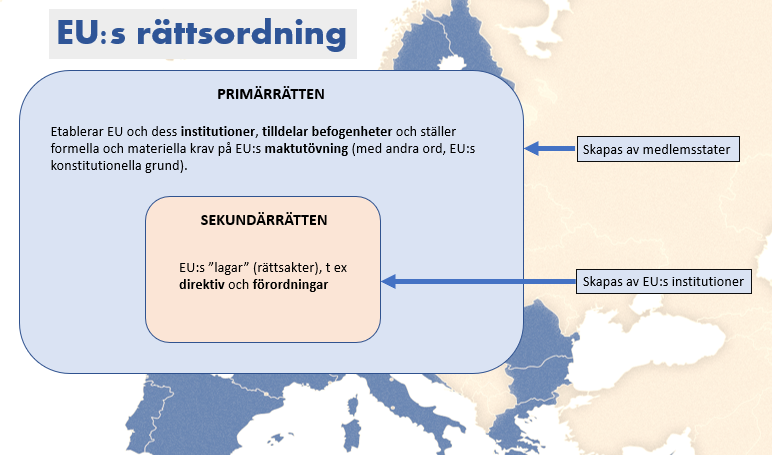 EU är en självständig rättsordning, som samtidigt är en del av varje medlemsstats rättsordning. I detta avsnitt ska vi först läsa om EU:s interna rättsordning, vilka lagar och regler som ligger till grund för EU som union, de regler som skapar EU och dess interna rättsordning kallas för primärrätt.