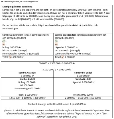När samboförhållandet upphör ska samboegendom fördelas genom bodelning (8 § SamboL). Mer om det nedan.