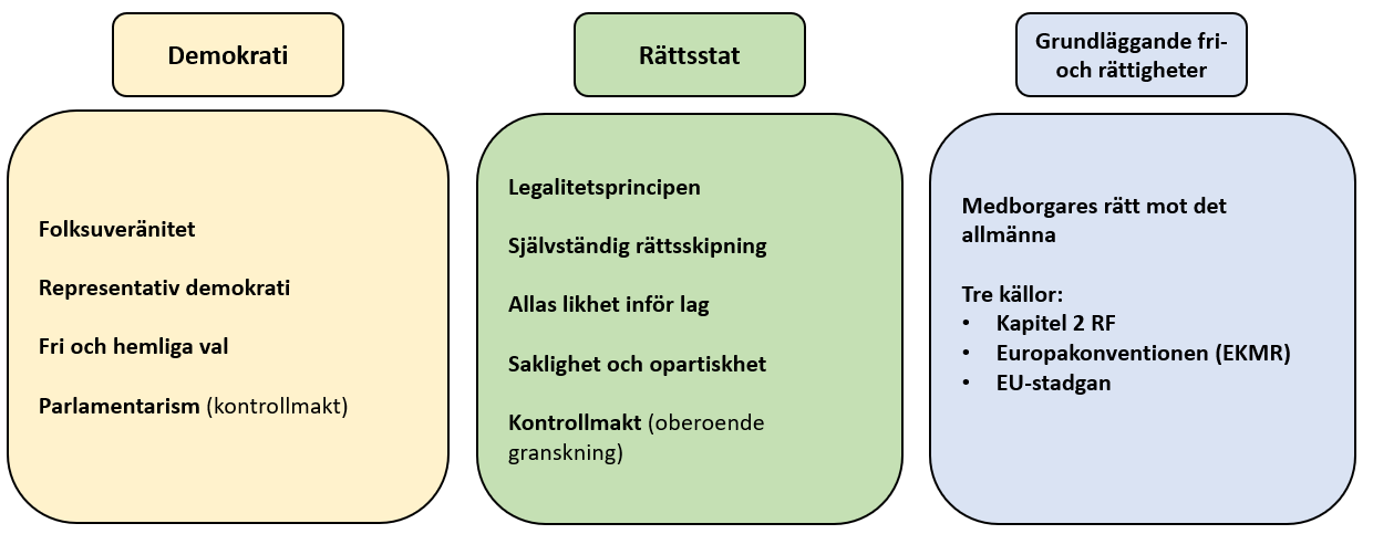 Rättsstaten innebär att det allmänna utövar sin makt under lag. Folket har rätt att rösta i fria och allmänna val, och lag i riksdagen fattas genom majoritetsbeslut. Exakt vilken sorts demokratisk rättsstat Sverige är beror på de fri- och rättigheter som medborgarna åtnjuter. Dessa hittar man bland annat i regeringsformen. Det innebär att alla demokratier olika. För att jämföra skillnaden mellan två ”demokratiska” länder måste man närmare undersöka vilka fri- och rättigheter som medborgarna har. Där hittar vi konkret vilka demokratiska värderingar ett samhälle genomsyras av.