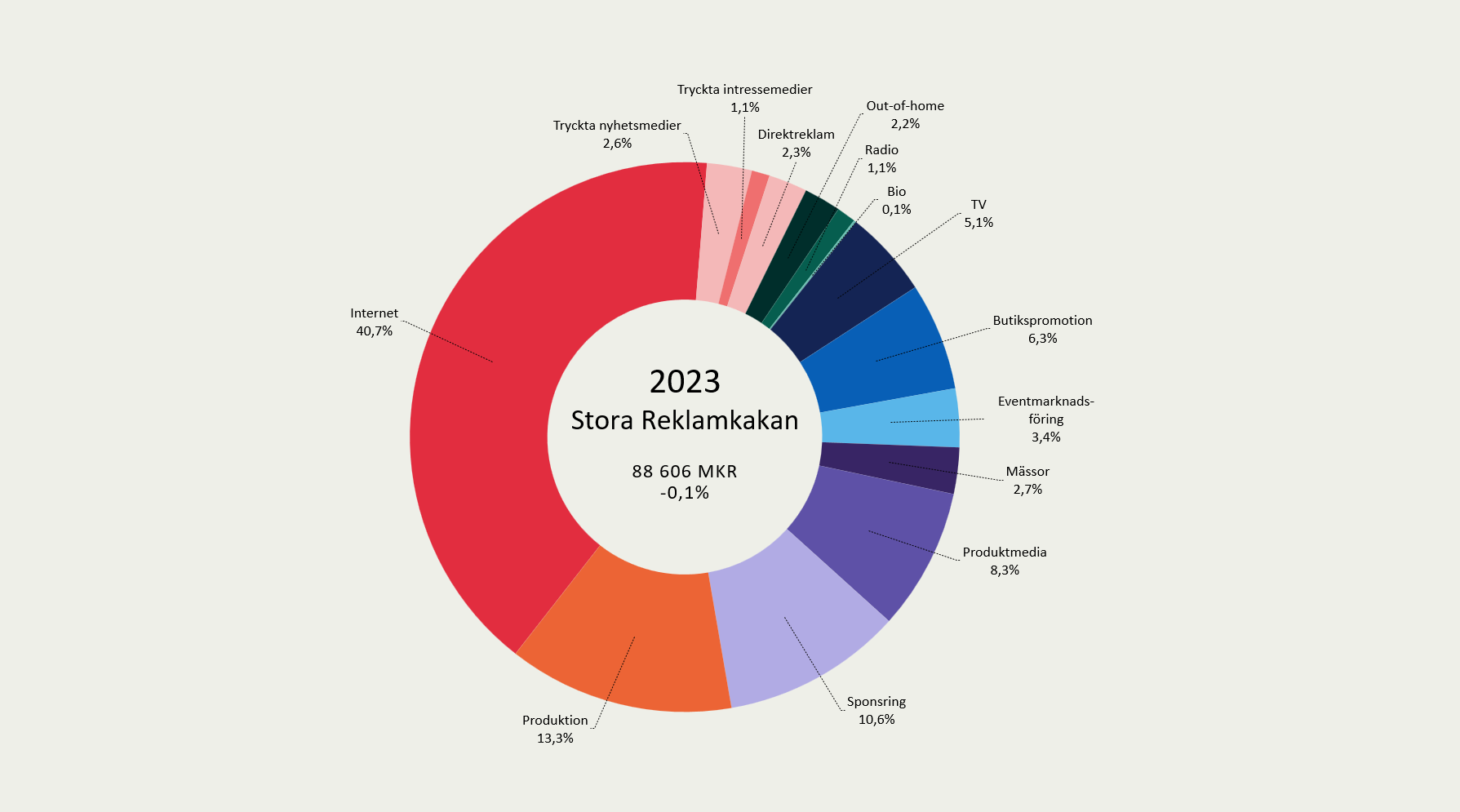 Varje år investeras betydande belopp i marknadsföringssyfte. 2023 investerades ca 88 miljarder SEK. Där den absolut största posten, ca 40 %, är reklam på Internet.