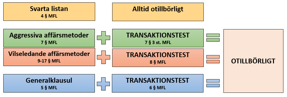 Marknadsföringslagens syfte är att förhindra otillbörlig marknadsföring. Det innebär i detta fall oacceptabel eller otillåten marknadsföring. Vad som är otillbörligt listas bland annat i svarta listan, som gäller som lag i Sverige, men också de vilseledande och aggressiva metoder som nämns i lagen. Även marknadsförings som strider mot god marknadsföringssed anses otillbörlig. Det räcker dock inte bara att konstatera att marknadsföring är till exempel vilseledande. Reklamen måste konstateras ha en viss effekt på mottagaren. Detta prövar man genom transaktionstestet (mer om det längre fram).