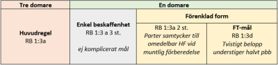 Huvudregeln är att tvist i tingsrätt avgörs med tre domare, RB 1:3a. Det finns dock en rad undantag då man anser att endast en domare räcker. Det kan till exempel handla om att saken i sig inte är särskilt komplicerad, RB 1:3a 3 st. Men även om parterna själva går med på att hålla förhandling direkt i anslutning till muntlig förberedelse, 1:3a 2 st, eller om målet är ett så kallat förenklat mål (FT-mål). Det är ett FT-mål om värdet på det parterna tvistar om understiger ett prisbasbelopp (2023 var det 26 750 kr).