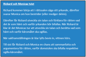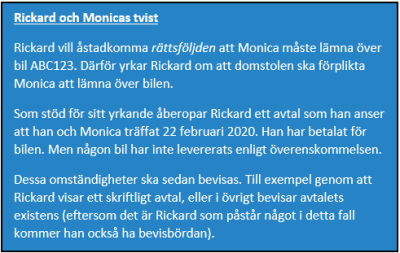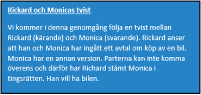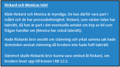Vem som har rätt att överhuvudtaget driva en process är den som berörs av frågan. I vårt fall är det Rickard och Monica som är parter och har talerätt. En vän till Rickard kan inte driva process mot Monica och yrka på att hon ska överlämna en bil enligt avtal mellan Rickard och henne. Endast den som berörs av frågan direkt kan driva process. Den skadelidande, eller borgenär kan driva talan.