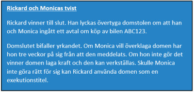 När tiden för överklagande har gått ut vinner domen laga kraft. Det innebär att den står sig. Den går inte att överklaga längre och kan verkställas. Att domen kan verkställas innebär att den går att använda som exekutionstitel. Skulle det vara så att den som förlorat i tvisten inte gör rätt för sig självmant kan staten, via Kronofogdemyndigheten, utmäta egendom. Det innebär i slutändan staten med tvång tar den egendom som kärande har rätt till enligt domen.
